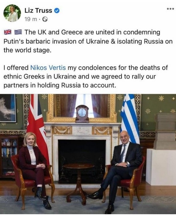 Η υπουργός Εξωτερικών της Βρετανίας Λιζ Τρας τάγκαρε τον Νίκο Βέρτη αντί για τον Νίκο Δένδια και «έριξε» το Twitter