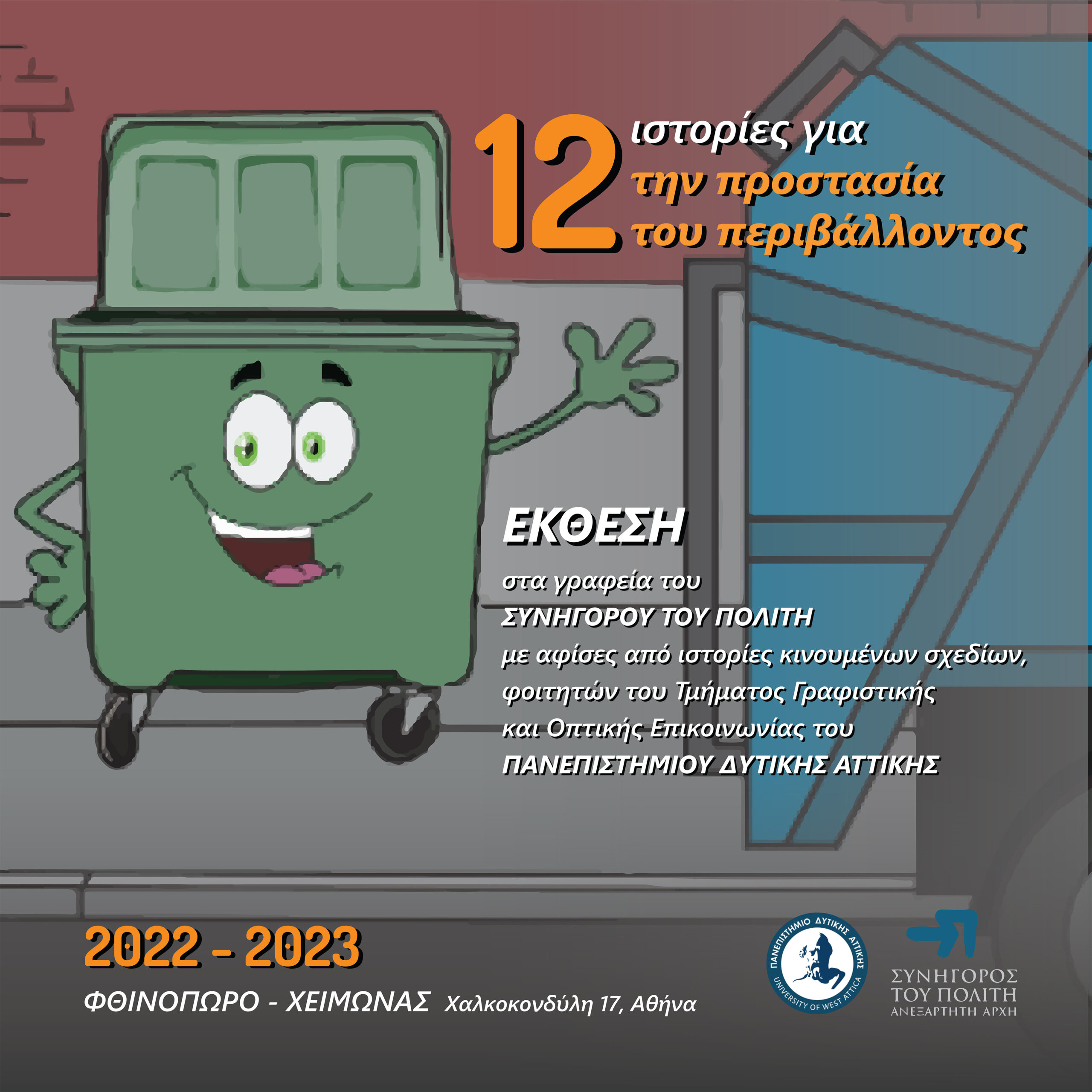 Πρόκειται για την έκθεση «12 ιστορίες για την προστασία του περιβάλλοντος» που περιλαμβάνει έργα φοιτητών και φοιτητριών του Ε’ εξαμήνου του τμήματος Γραφιστικής και Οπτικής Επικοινωνίας τα οποία δημιουργήθηκαν κατά τη διάρκεια του μαθήματος Εικονογραφημένο Σενάριο (Storyboard).