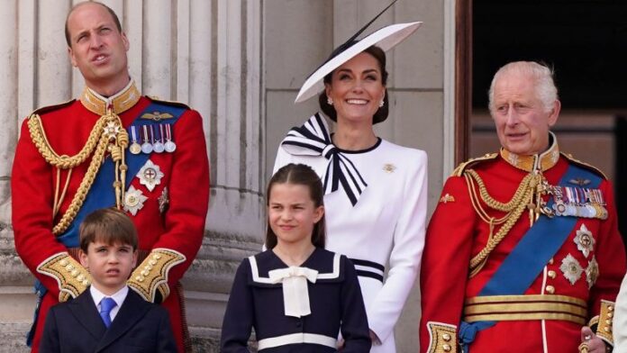 Η Κέιτ Μίντλετον ντυμένη με ένα ανοιχτόχρωμο σύνολο, παρακολούθησε μαζί με τα μέλη της βασιλικής οικογένειας μια θεαματική επίδειξη της Βασιλικής Πολεμικής Αεροπορίας (RAF), καθώς επέστρεψε θριαμβευτικά στα βασιλικά της καθήκοντα, στη μεγάλη γιορτή Trooping the Color για τα επίσημα γενέθλια του Βρετανού μονάρχη, βασιλιά Καρόλου.