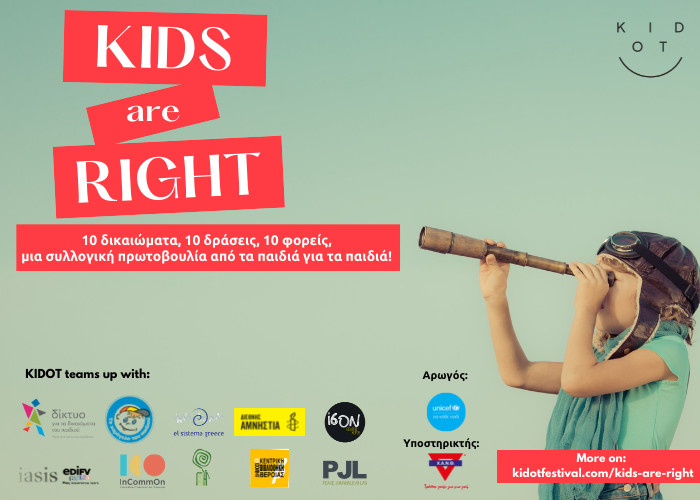 Δέκα οργανώσεις που δραστηριοποιούνται στην αντιμετώπιση κοινωνικών προκλήσεων σε Θεσσαλονίκη, Αθήνα και Βέροια ανέλαβαν να διαδώσουν δέκα δικαιώματα του παιδιού, στο πλαίσιο του πρότζεκτ «KIDS are RIGHT», που διοργανώνει τον Νοέμβριο το KIDOT.