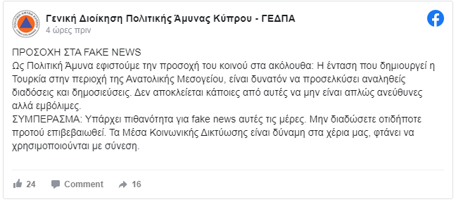Ως Πολιτική Άμυνα εφιστούμε την προσοχή του κοινού στα ακόλουθα: Η ένταση που δημιουργεί η Τουρκία στην περιοχή της Ανατολικής Μεσογείου, είναι δυνατόν να προσελκύσει αναληθείς διαδόσεις και δημοσιεύσεις. Δεν αποκλείεται κάποιες από αυτές να μην είναι απλώς ανεύθυνες αλλά εμβόλιμες.