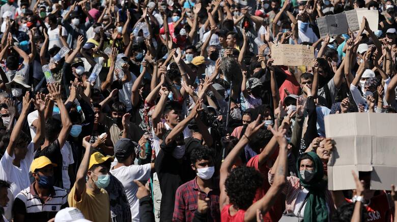 Οι διαδηλωτές, κυρίως Αφγανοί, φωνάζουν «Αζαντί -Αζαντί» («ελευθερία» στα αφγανικά) και ζητούν να μεταφερθούν στην ηπειρωτική Ελλάδα, αρνούμενοι να μετακινηθούν στη νέα προσωρινή δομή φιλοξενίας στο γειτονικό πεδίο βολής.