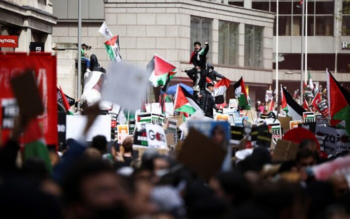Χιλιάδες άνθρωποι διαδήλωσαν σήμερα στο κέντρο του Λονδίνου, για να εκφράσουν την αλληλεγγύη τους στον παλαιστινιακό λαό, καλώντας τη βρετανική κυβέρνηση να παρέμβει για να σταματήσει η ισραηλινή στρατιωτική επιχείρηση.
