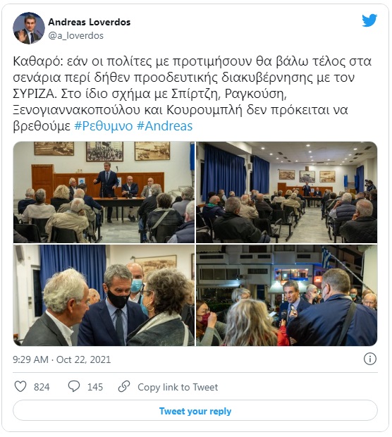 Σε ανάρτησή του στον προσωπικό του λογαριασμό στο twitter: «Καθαρό: εάν οι πολίτες με προτιμήσουν θα βάλω τέλος στα σενάρια περί δήθεν προοδευτικής διακυβέρνησης με τον ΣΥΡΙΖΑ. Στο ίδιο σχήμα με Σπίρτζη, Ραγκούση, Ξενογιαννακοπούλου και Κουρουμπλή δεν πρόκειται να βρεθούμε».