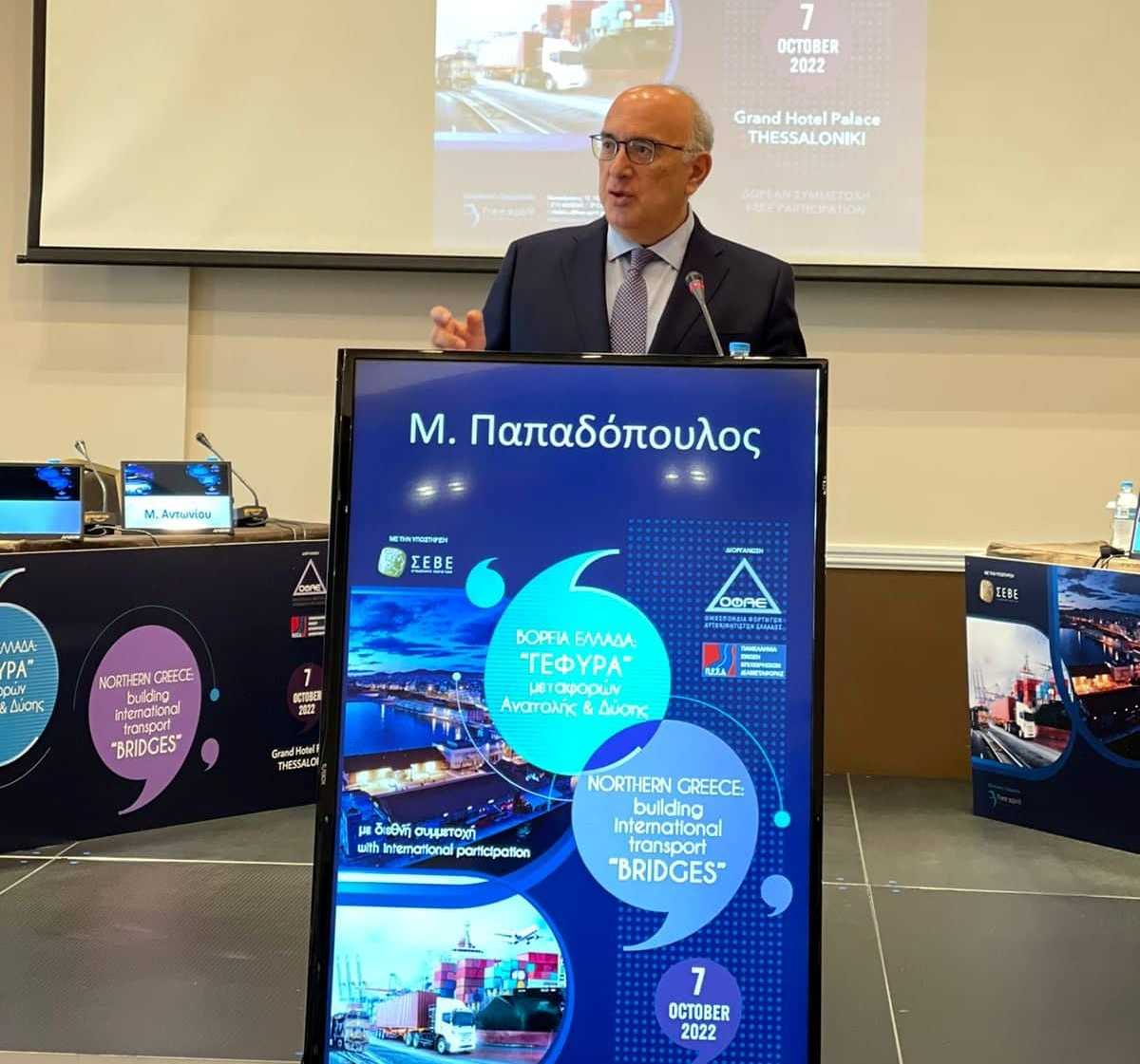 Τη στρατηγική του Υπουργείου Υποδομών και Μεταφορών για την ενίσχυση της ανταγωνιστικότητας της Βόρειας Ελλάδας ως διεθνούς δικτύου συνδυασμένων μεταφορών, παρουσίασε ο Υφυπουργός Υποδομών και Μεταφορών, αρμόδιος για τις Μεταφορές κ. Μιχάλης Παπαδόπουλος, σήμερα, Παρασκευή 7 Οκτωβρίου 2022 στη Θεσσαλονίκη, στο Συνέδριο της Ομοσπονδίας Φορτηγών Αυτοκινητιστών Ελλάδας (ΟΦΑΕ) με θέμα: «Βόρεια Ελλάδα: Γέφυρα μεταφορών Ανατολής και Δύσης».