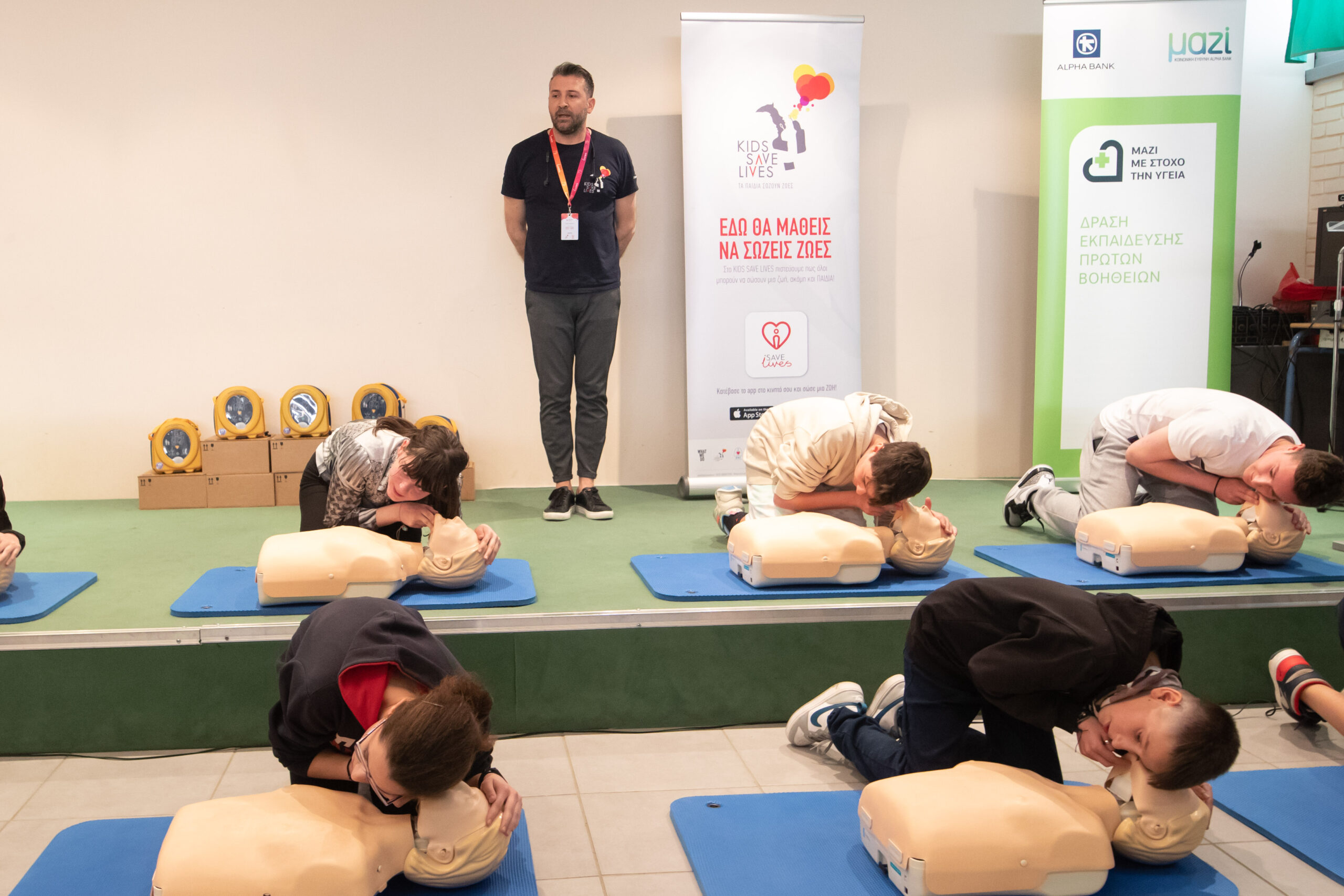 Την εκπαίδευση 530 μαθητών και εκπαιδευτικών σε Καρδιοπνευμονική Αναζωογόνηση (ΚΑΡΠΑ) και Πρώτες Βοήθειες περιλαμβάνει μεταξύ άλλων η ολοκληρωμένη δράση εκπαίδευσης Πρώτων Βοηθειών που εγκαινίασε σε 8 εκπαιδευτικά ιδρύματα της Λαμίας η Alpha Bank, σε συνεργασία με την Ανθρωπιστική Οργάνωση Κοινωνίας Πολιτών KIDS SAVE LIVES – Τα παιδιά Σώζουν Ζωές, στο πλαίσιο του προγράμματος Εταιρικής Υπευθυνότητας «Μαζί με στόχο την υγεία».