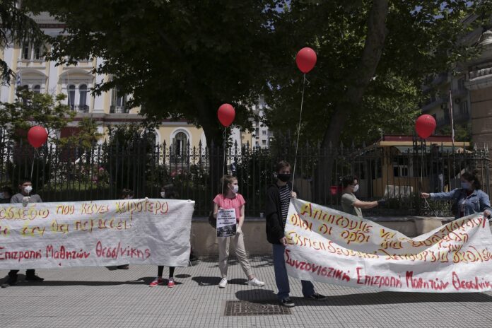 Διαμαρτυρία για τις νέες ρυθμίσεις στην εκπαίδευση έκαναν μαθητές, μέλη της «Συντονιστικής Επιτροπής Μαθητών Θεσσαλονίκης», το μεσημέρι, έξω από το ΥΜΑΘ.
