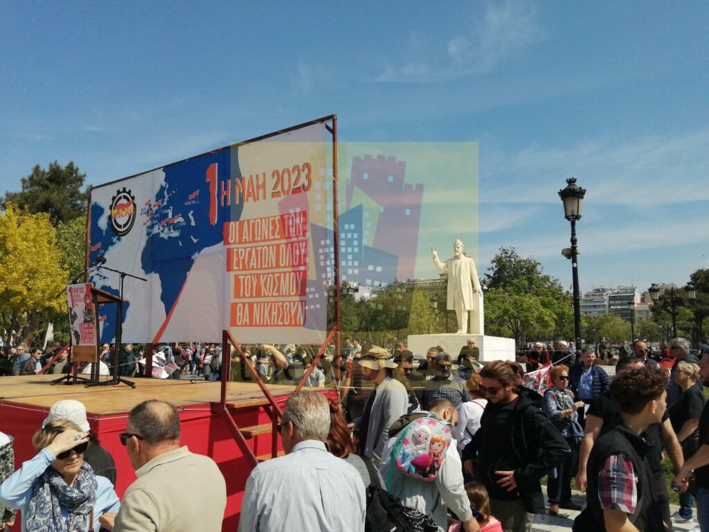 Την ίδια ώρα, Εργατικά Σωματεία , που συσπειρώνονται στο ΠΑΜΕ συγκεντρώθηκαν στο άγαλμα Βενιζέλου και έκαναν πορεία, με κατάληξη στη συμβολή των οδών Εγνατία και Βενιζέλου, στην παλιά θέση του Μνημείου του Εργάτη, όπου τηρήθηκε ενός λεπτού σιγή και έγινε κατάθεση στεφάνων. Κατά τη διάρκεια της πορείας οι διαδηλωτές άφησαν λουλούδια σε δύο σημεία στο ύψος της πλατείας Αγίας Σοφίας, όπου σημειώθηκαν πρόσφατα δύο εργατικά δυστύχηματα.