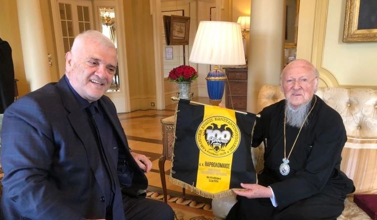 Ο διοικητικός ηγέτης της ΑΕΚ τίμησε τον Οικουμενικό Πατριάρχη Βαρθολομαίο με το Μετάλλιο της Τιμής – Ο Χρυσός Δικέφαλος Αετός και το λάβαρο του συλλόγου.