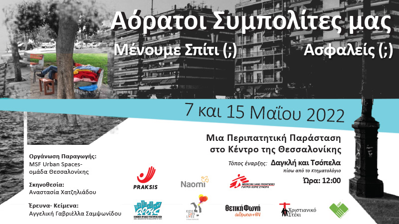 Το δίκτυο MSF Urban Spaces Θεσσαλονίκης θέτοντας τα παραπάνω ερωτήματα επιχειρεί να ανοίξει εκ νέου την συζήτηση διοργανώνοντας για δεύτερη φορά την διαδραστική – περιπατητική παράσταση με τίτλο «Μένουμε σπίτι; Ασφαλείς; Αόρατοι συμπολίτες μας»
