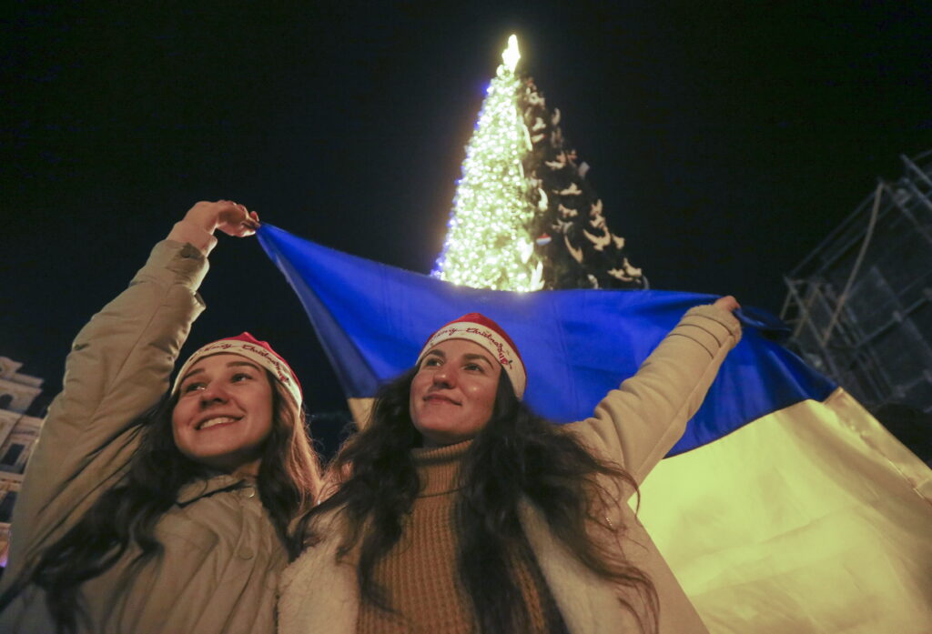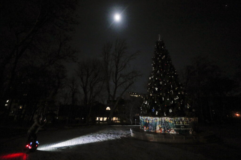 Παραμονή Πρωτοχρονιάς και το πνεύμα των εορτών δεν έχει εγκαταλείψει την πρωτεύουσα της Ουκρανίας. Στο Κίεβο, άνδρες και γυναίκες φωτογραφήθηκαν κάτω από το χριστουγεννιάτικο δέντρο με τις σημαίες της Ουκρανίας. Ωστόσο οι μαζικές συγκεντρώσεις απαγορεύτηκαν από τις 11 το βράδυ ως τις 5 το πρωί, λόγω του φόβου των ρωσικών πυραυλικών επιθέσεων. Φόβοι που τελικά επιβεβαιώθηκαν, καθώς πριν την αυγή του νέου έτους οι περισσότεροι δρόμοι του Κιέβου ήταν σκοτεινοί, με το χριστουγεννιάτικο δέντρο, να παραμένει και αυτό με τα λαμπάκια του σβηστά. Οι ρωσικές πυραυλικές επιθέσεις σε υποδομές παροχής ηλεκτρισμού στην Ουκρανία, εντάθηκαν τους τελευταίους μήνες του 2022 και ειδικότερα πριν την Πρωτοχρονιά.