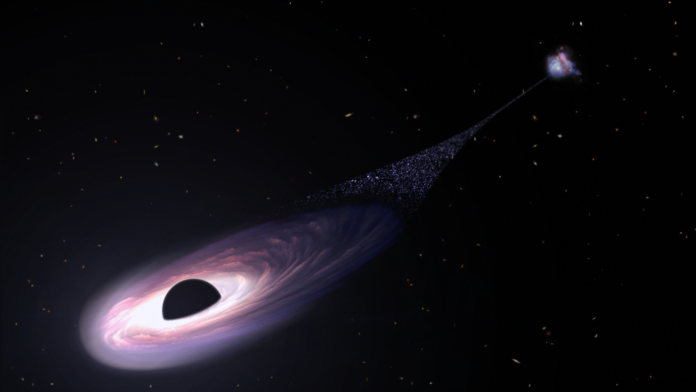 Αναλύοντας εικόνες από το διαστημικό τηλεσκόπιο Hubble της NASA οι ερευνητές ανακάλυψαν μια ασυνήθιστη, πολύ λεπτή, σχεδόν ευθεία λωρίδα νεαρών αστεριών. Έπειτα από παρατηρήσεις με το φασματόμετρο απεικόνισης χαμηλής ανάλυσης και το φασματογράφο εγγύς υπερύθρου του Αστεροσκοπείου Keck συμπέραναν ότι έβλεπαν το επακόλουθο μιας μαύρης τρύπας που πετούσε. Τα ευρήματα δημοσιεύονται στο περιοδικό «The Astrophysical Journal Letters».