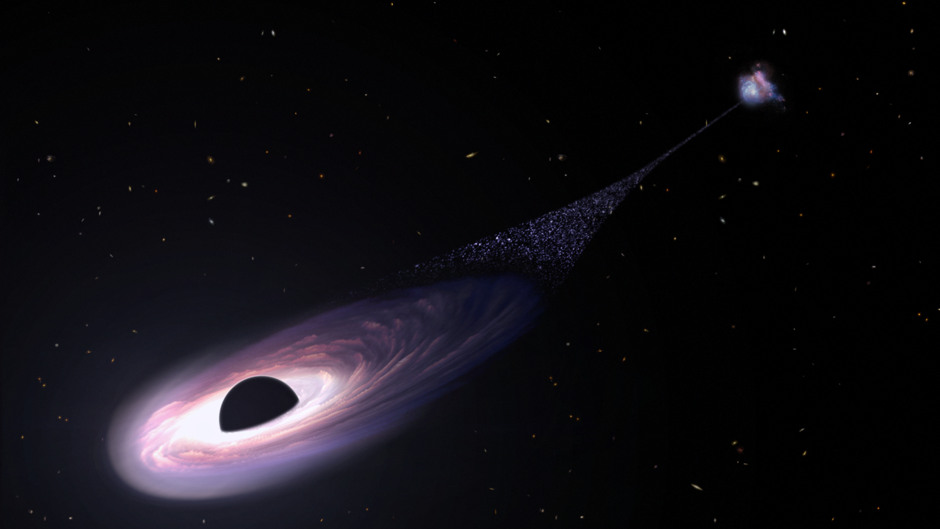 Η μαύρη τρύπα έχει αφήσει πίσω της ένα πρωτοφανές ίχνος από νεογέννητα αστέρια μήκους 200.000 ετών φωτός. «Πιστεύουμε ότι βλέπουμε ένα κύμα πίσω από τη μαύρη τρύπα, όπου το αέριο ψύχεται και είναι σε θέση να σχηματίσει αστέρια. Έτσι βλέπουμε τον σχηματισμό άστρων που ακολουθούν τη μαύρη τρύπα», δηλώνει ο καθηγητής Αστρονομίας και Φυσικής στο Πανεπιστήμιο Γέιλ και επικεφαλής συγγραφέας της μελέτης, Πίτερ Βαν Ντόκουμ. Όπως προσθέτει χαρακτηριστικά: «Αυτό που βλέπουμε είναι αυτό που επακολουθεί. Όπως τα απόνερα πίσω από ένα πλοίο, βλέπουμε τα απόνερα πίσω από τη μαύρη τρύπα».