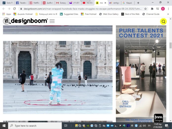 Στη δημόσια περφόρμανς «No Escape (Καμιά Διαφυγή)» στο Μιλάνο, ένας άντρας τυλιγμένος με προστατευτικές μάσκες προσπαθεί να κινηθεί.