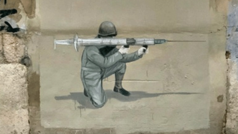 Τοιχογραφία για τον εμβολιασμό κατά του ιού δημιούργησε ο καλλιτέχνης δρόμου Escif, ο οποίος ολοκλήρωσε πριν λίγο καιρό σειρά δημόσιων εικαστικών παρεμβάσεων στην Κορσική και τους επόμενους μήνες αναχωρεί για Λιθουανία και βόρεια Ιταλία. Στην τοιχογραφία του, ένας στρατιώτης έχει γονατίσει και ετοιμάζεται να βάλει με μία σύριγγα, δίκην μπαζούκα.