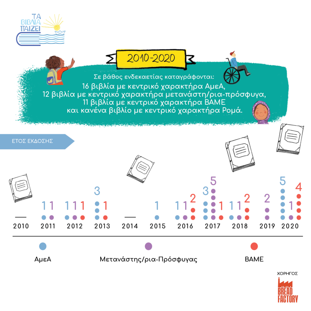 Ενδιαφέρον προκαλεί το γεγονός ότι κατά τη χρονική αφετηρία της έρευνας το 2010 δεν βρέθηκε κανένα βιβλίο με κεντρικό χαρακτήρα που να ανήκει σε μία από τις υπό διερεύνηση κοινωνικές ομάδες, ενώ κατά το 2020 παρουσιάζεται η μεγαλύτερη εκδοτική παραγωγή βιβλίων με αυτούς τους κεντρικούς χαρακτήρες, φτάνοντας συνολικά τα δέκα βιβλία. Τη χρονιά αυτή έχουμε και το μεγαλύτερο αριθμό βιβλίων με κεντρικούς χαρακτήρες ΒΑΜΕ και ΑΜΕΑ, ενώ τα περισσότερα βιβλία της εντεκαετίας με ήρωες πρόσφυγες ή μετανάστες καταγράφονται το 2017.