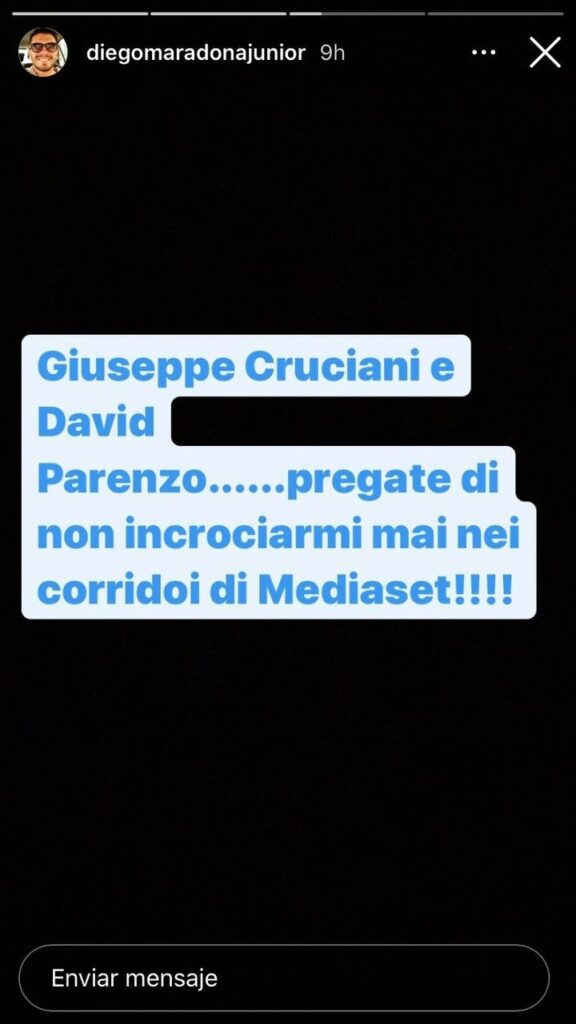 «Κρουτσιάνι και Παρέντσο, να εύχεστε να μη σας πετύχω στους διαδρόμους του Mediaset», έγραψε αγριεμένος ο γιος του Αργεντινού μεγάλου άσου. Οι δύο δημοσιογράφοι, στη συνέχεια, απολογήθηκαν στην οικογένεια του Μαραντόνα και ο γιος του φαίνεται πως τους συγχώρησε. «Μόλις μου απολογήθηκαν για τα ανάρμοστα λόγια που είπαν. Για μένα το θέμα θεωρείται λήξαν», ανέφερε ο Ντιέγκο Μαραντόνα τζούνιορ σε νέο μήνυμά του στο Instagram.