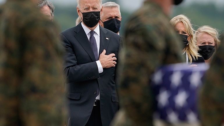 Ο πρόεδρος Τζο Μπάιντεν έκλεισε τα μάτια και έγειρε προς τα πίσω το κεφάλι, καθώς τα φέρετρα, τυλιγμένα με την αμερικανική σημαία, με τις σορούς των 11 Αμερικανών στρατιωτών οι οποίοι σκοτώθηκαν στη βομβιστική επίθεση της περασμένης Πέμπτης στην Καμπούλ, έφτασαν με στρατιωτικό αεροσκάφος στη βάση Ντόβερ του Ντέλαγουερ.