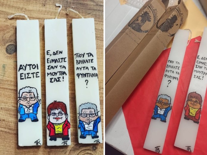 «Μου ζήτησαν μία λαμπάδα με την ατάκα του «Αυτοί είστε», από εκεί και πέρα κοινωνικοποιήθηκε στα social και ζητούσαν κι άλλες ατάκες. Πέρσι δεν πρόλαβα και φέτος ξεκίνησα να τις φτιάχνω μετά τα Χριστούγεννα. Το χερι δεν πάει πιο… δεξιά να φτιάξει κάτι», απάντησε στην ερώτηση αν θα φτιάξει και λαμπάδες και για άλλα κόμματα.