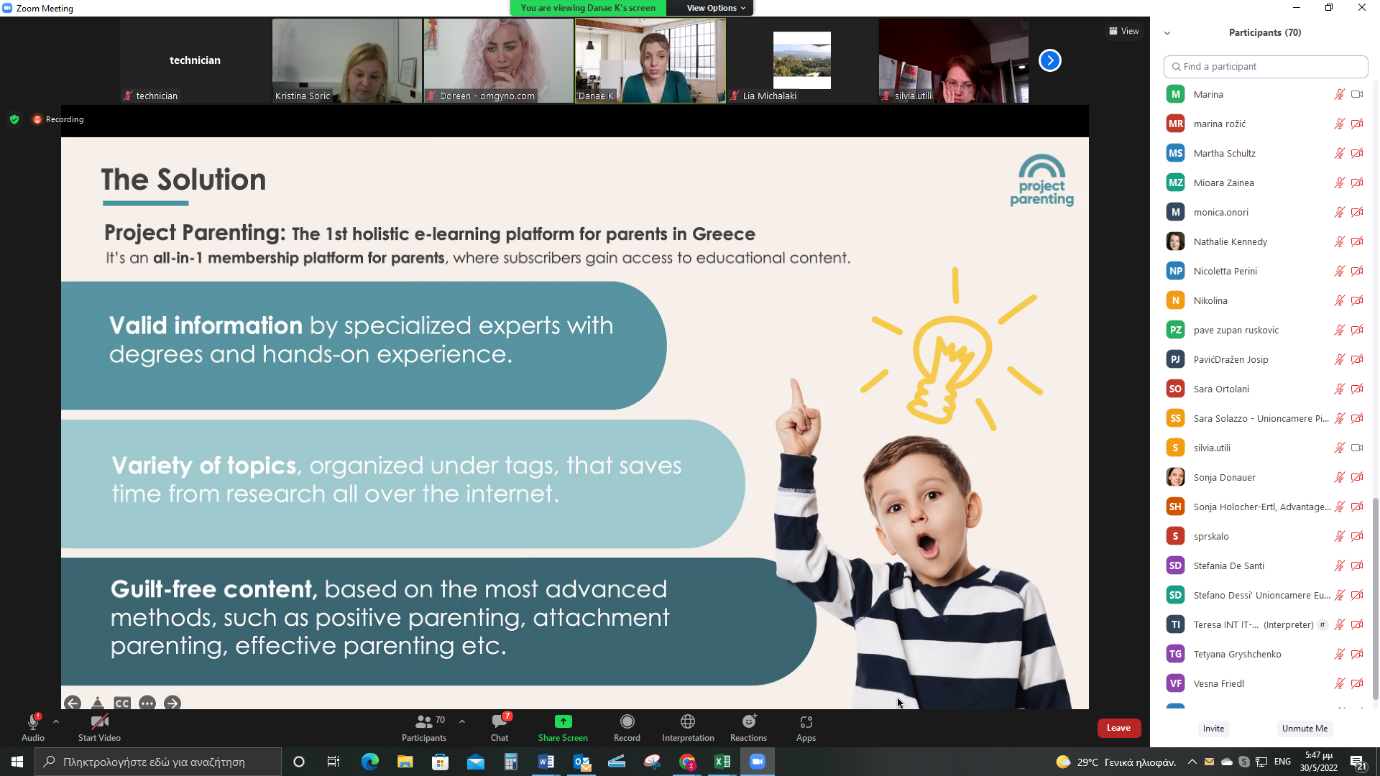 Οι δύο βέλτιστες πρακτικές που επιλέχθηκαν από την Ευρώπη να παρουσιαστούν στο πλαίσιο της θεματικής ενότητας Ψηφιακή μετάβαση ήταν η Omgyno και η Projectparenting. Ειδικότερα, η Omgyno είναι μια νεοφυής καινοτόμα επιχείρηση που απευθύνεται από γυναίκες σε γυναίκες και προσφέρει υπηρεσίες τηλεϊατρικής με γυναικολόγους, home test για γυναικολογικές εξετάσεις, καθώς, επίσης, και προϊόντα για τη σεξουαλική υγεία. Ενώ, η Project Parenting (projectparenting.gr) είναι η 1η ολιστική e-learning Συνδρομητική Πλατφόρμα για Γονείς στην Ελλάδα. Αποτελεί μεγάλη τιμή και αναγνώριση του σημαντικού έργου της Θερμοκοιτίδας ΘΕΑ και του προγράμματος επιτάχυνσης Project Gazelle του ΕΒΕΑ, όπου σε συνεργασία με το ΕΕΔΕΓΕ, μετά από πρόσκληση και αξιολόγηση γυναικείων start ups, τις εκπαιδεύουν στο επιχειρείν.