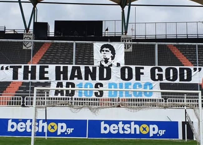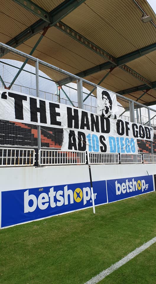 Το δικό τους αντίο λένε οι οργανωμένοι οπαδοί του ΟΦΗ στον Ντιέγκο Μαραντόνα, με ανάρτηση ενός πανό στο γήπεδο ”Θεόδωρος Βαρδινογιάννης” στη θύρα 4 στο παιχνίδι με τον ΠΑΣ Γιάννινα.
