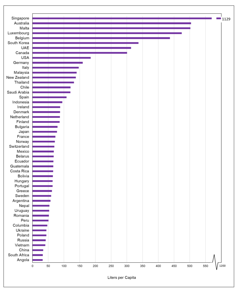 Οι πολίτες της Ασίας είναι οι μεγαλύτεροι καταναλωτές εμφιαλωμένου νερού, ακολουθούμενοι από τους Βορειοαμερικανούς και τους Ευρωπαίους. Το 60% των παγκόσμιων πωλήσεων είναι στον παγκόσμιο Νότο (Ασία- Ειρηνικός, Αφρική, Λατινική Αμερική και Καραϊβική). Ανά χώρα, οι ΗΠΑ είναι η μεγαλύτερη αγορά και ακολουθούν η Κίνα και η Ινδονησία. Οι τρεις αυτές χώρες αποτελούν σχεδόν το ήμισυ της παγκόσμιας αγοράς. Στη λίστα με τις χώρες με τις υψηλότερες πωλήσεις εμφιαλωμένου νερού σε εκατομμύρια δολάρια βρίσκεται και η Ελλάδα κατέχοντας την 50η θέση. Επίσης, κατέχει την 36η θέση στην κατανάλωση λίτρων κατά κεφαλήν.