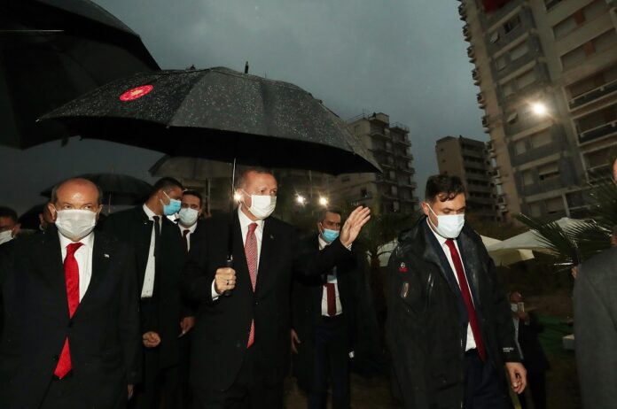 Ο Ρετζέπ Ταγίπ Ερντογάν έφτασε στην περίκλειστη πόλη των Βαρωσίων το απόγευμα της Κυριακής, κάτω από καταρρακτώση βροχή.