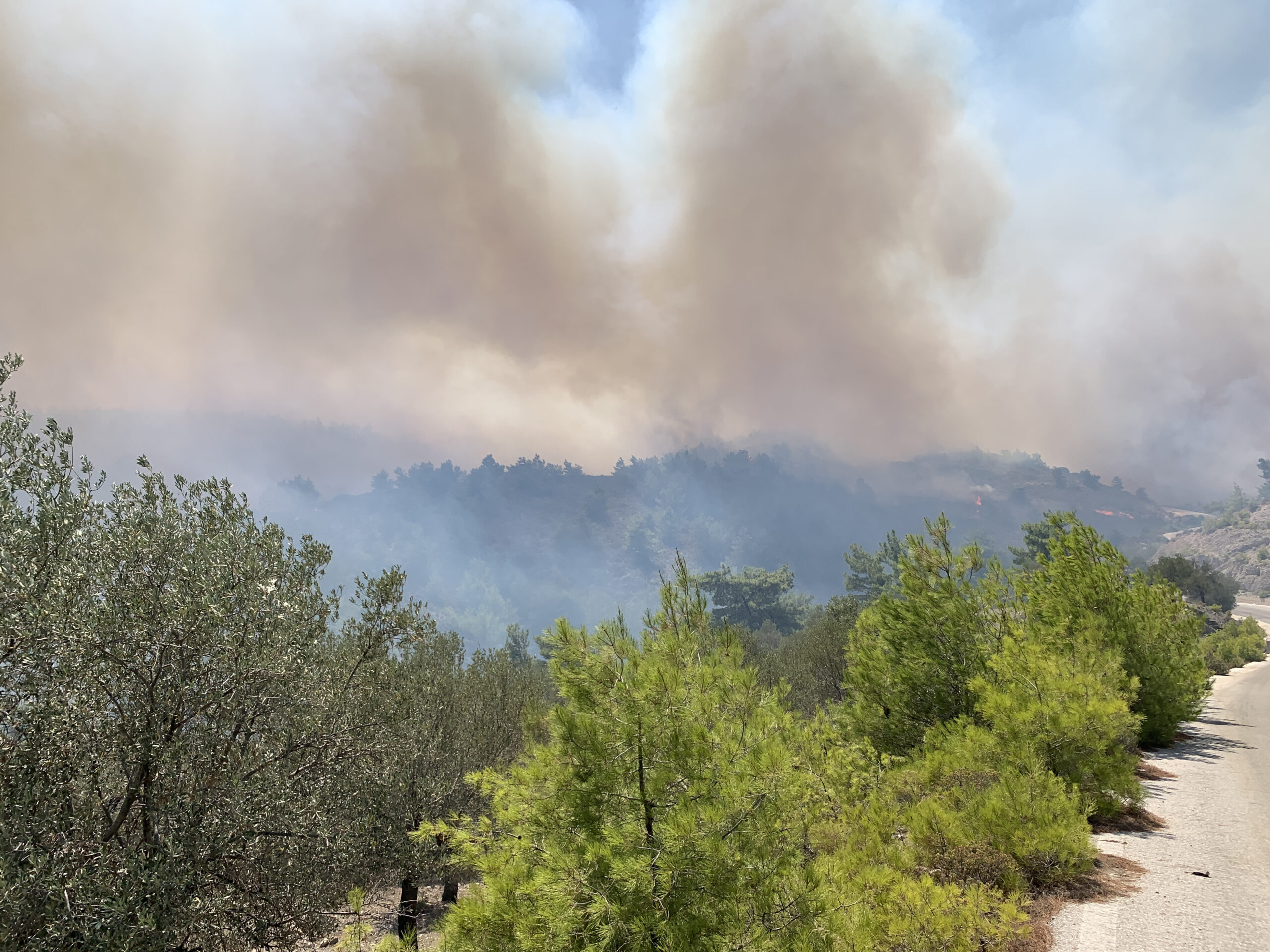 Τα εναέρια μέσα που βρίσκονται συνεχώς πάνω από την περιοχή προσπαθούν να ελέγξουν ένα τεράστιο μέτωπο που ξεπερνά τα 10 χιλιόμετρα και συνεχώς δημιουργούνται αναζωπυρώσεις, λόγω των ισχυρών ανέμων.