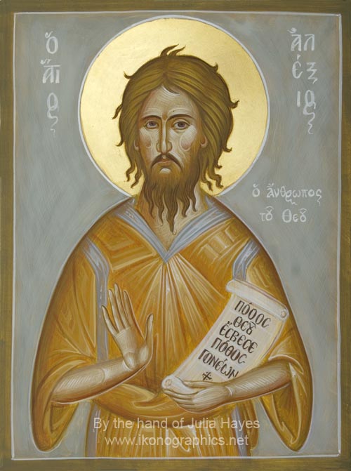 Ο Όσιος Αλέξιος γεννήθηκε στη Ρώμη κατά τους χρόνους των αυτοκρατόρων Αρκαδίου (395 – 408 μ.Χ.) και Ονωρίου (395 – 423 μ.Χ.) από ευσεβείς και εύπορους γονείς. Ο πατέρας του Ευφημιανός ήταν συγκλητικός, φιλόπτωχος και συμπαθής, ώστε καθημερινά παρέθετε τρεις τράπεζες στο σπίτι του για τα ορφανά, τις χήρες και τους ξένους που ήταν πτωχοί. Η γυναίκα του ονομαζόταν Αγλαΐς και ήταν άτεκνη. Στη δέησή της να αποκτήσει παιδί, ο Θεός την εισάκουσε. Και τους χάρισε υιό. Αφού το παιδί μεγάλωσε κι έλαβε την κατάλληλη παιδεία, έγινε σοφότατος και θεοδίδακτος. Όταν έφθασε στη νόμιμη ηλικία, τον στεφάνωσαν με θυγατέρα από βασιλική και ευγενική γενιά. Το βράδυ όμως στο συζυγικό δωμάτιο ο Όσιος, αφού πήρε το χρυσό δακτυλίδι και τη ζώνη, τα επέστρεψε στην σύζυγό του και εγκατέλειψε τον κοιτώνα. Παίρνοντας αρκετά χρήματα από τα πλούτη του έφυγε με πλοίο περιφρονώντας την ματαιότητα της επίγειας δόξας. Καταφθάνει στην Λαοδικεία της Συρίας και από εκεί στην Έδεσσα της Μεσοποταμίας. Εκεί ο Όσιος Αλέξειος μοίρασε τα χρήματα στους πτωχούς, ακόμη και τα ιμάτιά του, και, αφού ενδύθηκε με κουρελιασμένα και χιλιομπαλωμένα ρούχα, κάθισε στο νάρθηκα του ναού της Υπεραγίας Θεοτόκου, ως ένας από τους πτωχούς. Προτίμησε έτσι να ζει με νηστεία όλη την εβδομάδα και να μεταλαμβάνει των Αχράντων Μυστηρίων κάθε Κυριακή, ενώ μόνο τότε έτρωγε λίγο άρτο και έπινε λίγο νερό.
