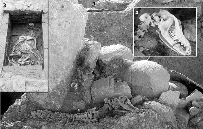 Όπως δήλωσε τότε ο επικεφαλής της ανασκαφής, σε αυτό το κομμάτι γης εντοπίσθηκε ένα πιθάρι ανάμεσα σε τεφροδόχους και χάλκινες φιάλες. Το στόμιο του πιθαριού ήταν στραμμένο προς τον βορρά και ακουμπούσε σε μια μεγάλη όρθια πέτρα. Όταν ανοίχτηκε ο πίθος διαπιστώθηκε ότι περιείχε έναν σκελετό σε συνεσταλμένη στάση. Πιθανότατα ανήκε σε 15χρονο αγόρι. Όταν όμως οι αρχαιολόγοι επιχείρησαν να διαμορφώσουν τον περιβάλλοντα χώρο, αφαιρώντας τα χώματα, στο ίδιο βάθος με τον πάτο του πιθαριού βρήκαν ακέραιο σκελετό σκύλου. Ήταν ένας κύων κρητικός ιχνηλάτης και εικάζεται ότι πέθανε από τη λύπη του για τον θάνατο του αγοριού. Μια άλλη ταφή με σκελετούς σκύλων είχε έρθει στο φως πριν χρόνια στο Καβούσι της ανατολικής Κρήτης.