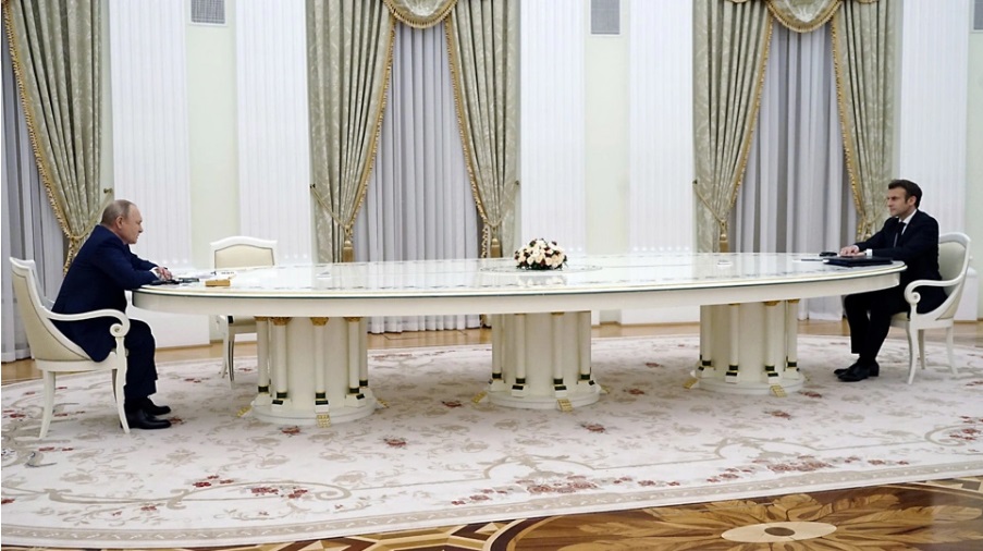 Αυτό φαίνεται πως σκέφθηκε και ο ίδιος ο Πούτιν, αφού επέλεξε να χρησιμοποιήσει στο κρίσιμο τετ-α-τετ του με τον Γάλλο πρόεδρο, τον πρώτο ουσιαστικά κορυφαίο πολιτικό της Δύσης που επισκέπτεται τη Μόσχα μετά την έναρξη της κρίσης, ένα… κωμικά μακρύ τραπέζι, που η όψη του και μόνο προκαλεί γέλιο και άφθονα ερωτηματικά!