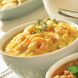 Ξεφουρνίζουμε και σερβίρουμε.Εν τω μεταξύ, έχουμε βράσει γαρίδες σε λίγο νερό.Παίρνουμε το ζουμι τους και το στραγγίζουμε.Του ρίχνουμε λίγο