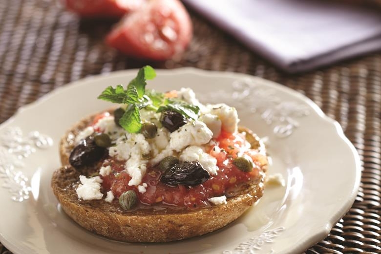 Τέλος, γαρνίρουμε με κάπαρη, ελιές και κρίταμο. Περιχύνουμε με μια κουταλιά κρέμα βαλσάμικου.