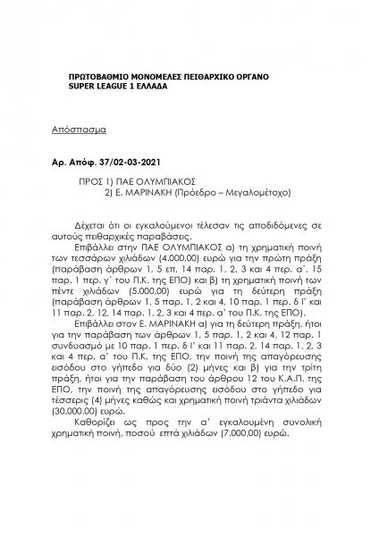 Α/ ΠΑΕ Ολυμπιακός, Ε. Μαρινάκης (Πρόεδρος – Μεγαλομέτοχος): «Βάσει των αναφερομένων στο από 21/02/2021 Φύλλο Αγώνα, το οποίο σας γνωστοποιήθηκε, κατ’ άρθρο 15 του Κανονισμού Αγώνων Ποδοσφαίρου (Κ.Α.Π.), στην από 21/02/2021 Έκθεση Παρατηρητή Αγώνα, και στην υπ’ αριθ. πρωτ. 1003/2/96/1/12-ιθ από 23/02/2021 Έκθεση της Αστυνομίας»: Επιβάλλει στην ΠΑΕ Ολυμπιακός συνολική χρηματική ποινή επτά χιλιάδων (7.000,00) ευρώ. Επίσης, επιβάλλει στον κ. E. Μαρινάκη συνολική ποινή απαγόρευσης εισόδου στο γήπεδο για πέντε (5) μήνες και χρηματική ποινή τριάντα χιλιάδων (30.000,00) ευρώ.