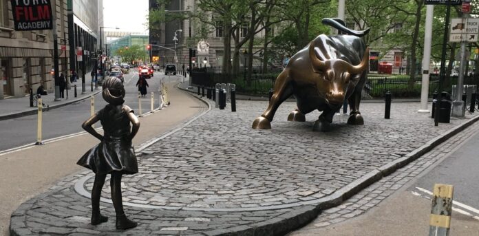 Ο ταύρος είχε εγκατασταθεί, παρανόμως, μπροστά από το Χρηματιστήριο της Νέας Υόρκης, μετά το χρηματιστηριακό κραχ του 1987, ως ένα σύμβολο της «ισχύος και της δύναμης του λαού». Ο ντι Μόντικα είχε μεταφέρει με φορτηγό το γλυπτό του τον Δεκέμβριο του 1989 στο Κάτω Μανχάταν και το είχε τοποθετήσει κάτω από ένα χριστουγεννιάτικο δέντρο μπροστά από το Χρηματιστήριο της Νέας Υόρκης, ως ένα χριστουγεννιάτικο δώρο για τους Νεοϋορκέζους.