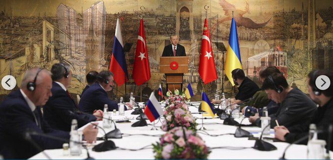 Ο Ρετζέπ Ταγίπ Ερντογάν απευθύνεται στις αντιπροσωπείες Ρωσίας και Ουκρανίας, οι οποίες διαπραγματεύονται στην Τουρκία για τον τερματισμό του πολέμου.