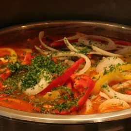 Σοτάρουμε στο λάδι τα κρεμμύδια για 5 λεπτά. Έπειτα προσθέτουμε τις πιπεριές κομμένες σε λουρίδες και τις σοτάρουμε. Στη συνέχεια ρίχνουμε τις ξεφλουδισμένες και ψιλοκομμένες ντομάτες, το αλάτι, το νερό, το ξύδι, το πιπέρι και το σκόρδο. Αφήνουμε το φαγητό να βράσει για 20 λεπτά.