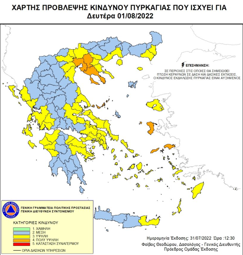 Πολύ υψηλός κίνδυνος πυρκαγιάς (κατηγορία κινδύνου 4) προβλέπεται σήμερα Δευτέρα 1 Αυγούστου, για τρεις περιφέρειες της χώρας, σύμφωνα με τον Χάρτη Πρόβλεψης Κινδύνου Πυρκαγιάς που εκδίδει η Γενική Γραμματεία Πολιτικής Προστασίας του υπουργείου Κλιματικής Κρίσης και Πολιτικής Προστασίας (www.civilprotection.gr).