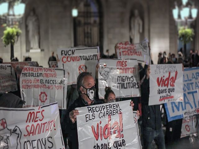 Ογκώδης συγκέντρωση στην πλατεία Sant Jaume στο κέντρο της Βαρκελώνης πραγματοποιήθηκε στις 26/10, εναντία στην απαγόρευση κυκλοφορίας μετά τις 22.00 και στα νέα μέτρα για την αντιμετώπιση της πανδημίας.