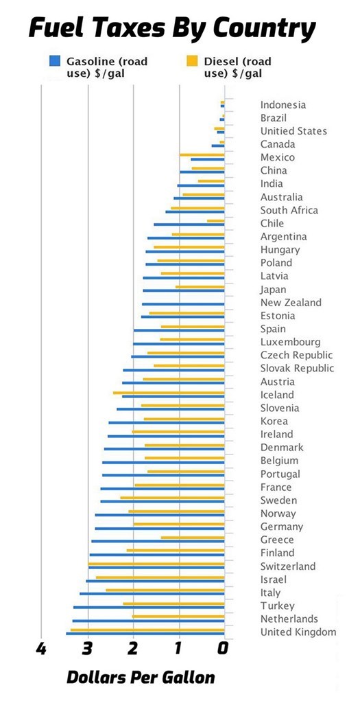 Την μεγαλύτερη φορολογία στην 1η θέση έχει το Ηνωμένο Βασίλειο τόσο στην βενζίνη όσο και στο πετρέλαιο (3.49 δολάρια φόρος ανά γαλόνι). Ακολουθούν η Ολλανδία, η Τουρκία η Ιταλία το Ισραήλ και η Ελβετία. Η Ελλάδα είναι στην 8η θέση έχοντας και το παράδοξο πως η φορολογία της βενζίνης είναι υπερδιπλάσια του πετρελαίου!