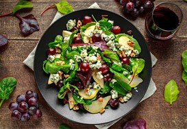 Προσθέτουμε τα καραμελωμένα καρύδια με τα αχλάδια και τα σταφύλια.