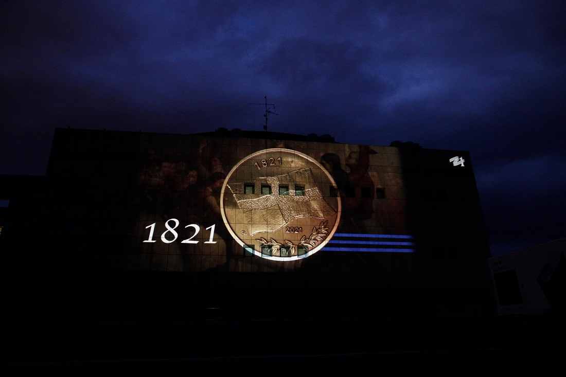 Όπως είχε προγραμματιστεί προβλήθηκε ταυτόχρονα, στις όψεις χαρακτηριστικών εμβληματικών κτιρίων, δεκαοκτώ πόλεων, με την τεχνική του projection mapping, μια οπτικοποιημένη αφήγηση του αγώνα του 1821, μέσα από έργα τέχνης τα οποία αναφέρονται σε αυτόν.