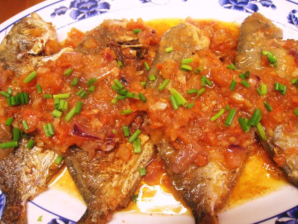 Τηγανίζουμε τα ψάρια και τα βάζουμε στεγνά σε μία βαθιά πιατέλα. Σε καθαρό τηγάνι ρίχνουμε άλλο λάδι. Όταν κάψει ρίχνουμε το αλεύρι και ανακατεύουμε ώσπου να ροδίσει. Προσθέτουμε το ξύδι, το νερό, το σκόρδο, τη δάφνη, το δενδρολίβανο, τις τριμμένες ντομάτες και το αλάτι. Σε σιγανή φωτιά ανακατεύουμε έως ότου πήξει η σάλτσα. Προς το τέλος ρίχνουμε το πιπέρι. Όταν πήξει την περιχύνουμε στα τηγανισμένα ψάρια.