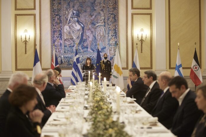 Με κάθε επισημότητα και με αυστηρό υγειονομικό πρωτόκολλο η Πρόεδρος της Δημοκρατίας Κατερίνα Σακελλαροπούλου υποδέχθηκε τους ξένους ηγέτες στο Προεδρικό Μέγαρο για το επίσημο δείπνο με την ευκαιρία του εορτασμού των 200 χρόνων από την Ελληνική Επανάσταση.