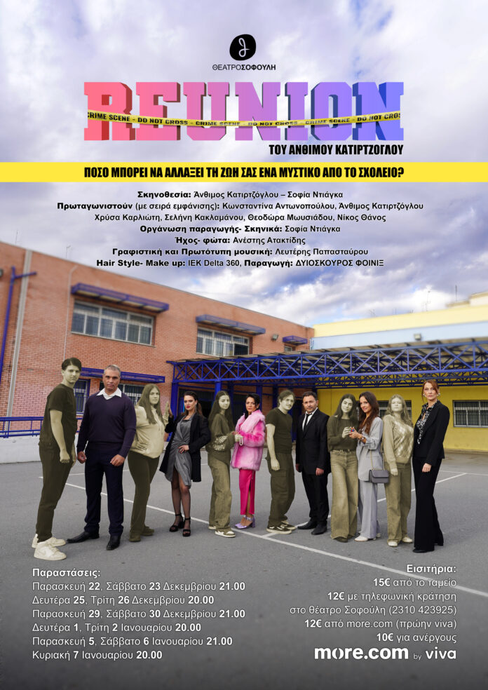 Μετά την μεγάλη περσινή επιτυχία ‘’Το Παιχνίδι’’ του Άνθιμου Κατιρτζόγλου, η Σκηνή Διασύνδεσης Καλλιτεχνών του Πολιτιστικού Σωματείου Θεάτρου και Τέχνης “ΔΥΙΟΣΚΟΥΡΟΣ ΦΟΙΝΙΞ”, επανέρχεται με το νέο καλλιτεχνικό έργο ‘’Reunion’’.