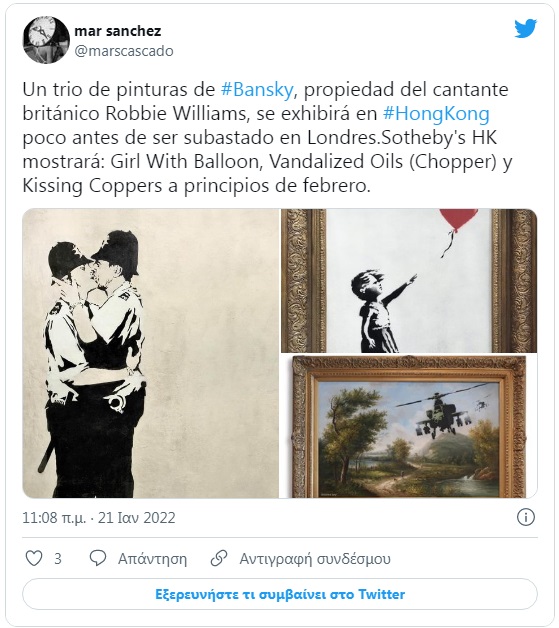 Το έργο – όπως περιγράφηκε από τον οίκο Sotheby’s που διοργάνωσε τη δημοπρασία στο Λονδίνο – αντικατοπτρίζει το «αντιπολεμικό μήνυμα» του καλλιτέχνη γκράφιτι.