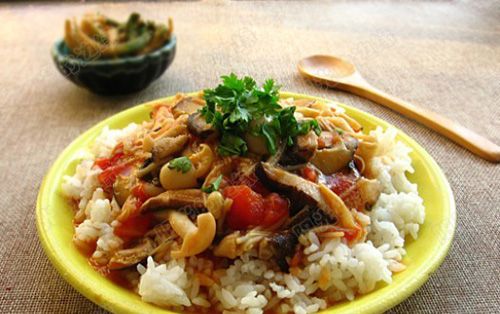 Σοτάρουμε τα κρεμμύδια με το λάδι και ρίχνουμε τα ψιλοκομμένα μανιτάρια. Προσθέτουμε το σκόρδο και στη συνέχεια τις ντομάτες, την πιπεριά, το αλάτι και το πιπέρι και δύο κούπες νερό. Βράζουμε τη σάλτσα μέχρι να απορροφηθεί όλο το νερό. Αφού βράσουμε το ρύζι, το σερβίρουμε στο πιάτο και ρίχνουμε από πάνω τη σάλτσα. Αν θέλουμε πασπαλίζουμε λίγο τριμμένο τυρί και ψιλοκομμένο μαϊντανό.