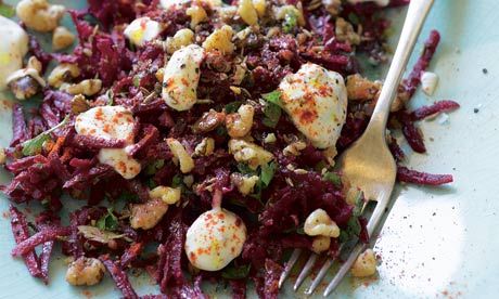Βράζουμε τα παντζάρια και τα βάζουμε σε μία πιατέλα. Σοτάρουμε τα μανιτάρια και τα ρίχνουμε πάνω από τα βρασμένα παντζάρια. Προσθέτουμε τους ξηρούς καρπούς, το σκόρδο και πασπαλίζουμε με αλάτι, λάδι και το βαλσάμικο.