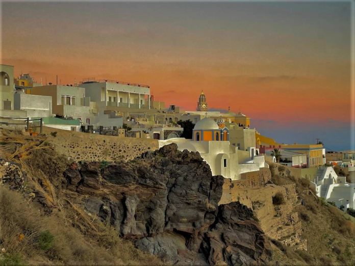Πρώτο Σαββατοκύριακο του Φεβρουαρίου, με την κακοκαιρία «Μπάρμπαρα» να επηρεάζει τη χώρα μας, μια ομάδα τουριστών, βρίσκεται μπροστά την εκκλησάκι του Αγίου Στυλιανού στα Φηρά της Σαντορίνης, και απολαμβάνει το ηλιοβασίλεμα.