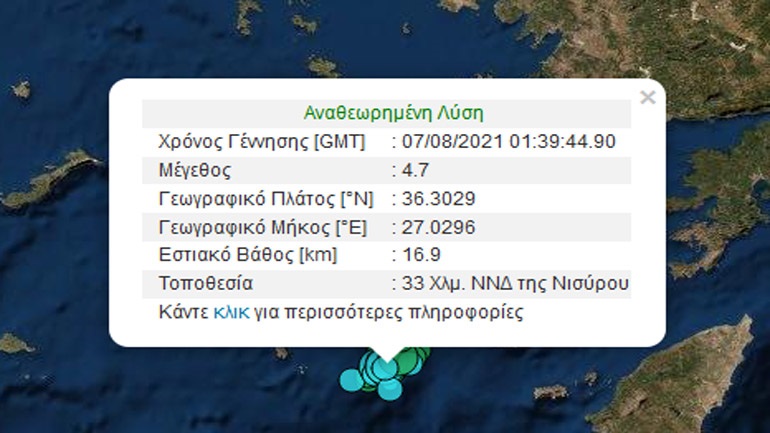 Σεισμική δόνηση μεγέθους 4,7 βαθμών της κλίμακας Ρίχτερ σημειώθηκε τα ξημερώματα του Σαββάτου στις 04.39 σε απόσταση 33 χλμ. νοτιοδυτικά της Νισύρου.